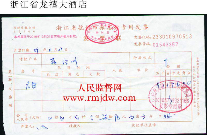 三张发票尤以龙禧大酒店金额最高,一天房费高达一千多元。但记者咨询龙禧大酒店却没有这个房价,大堂经理曰,应该有其他服务消费打在房卡里了。