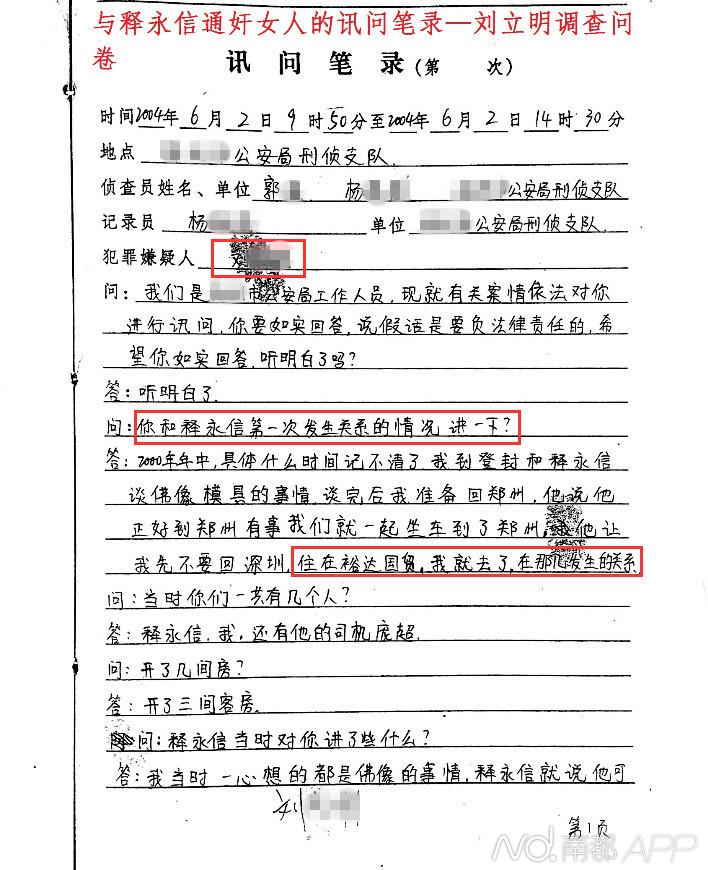 笔录中,释永信告诉侦查员,他要向公安机关反映刘某(女)敲诈他一事。释永信称,2000-2004年,经少林寺弟子释延虎、释延豹介绍,他与刘某相识。