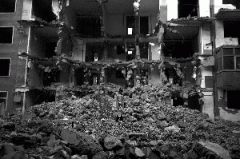 一位居民拿着水桶和洗好的衣服经过一处被损毁的居民楼。该楼的正中间从一楼到四楼被铲车挖了个大洞,而在楼的顶层仍然住着一家四口。 11月16日,老徐蜷缩在沙发里,身上穿着的