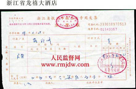 随后所附的三张杭州旅店业专用发票的照片和文字说明显示,第一张为2009年11月26日省委党校所开,金额660元;第二张为同一天浙江赞成宾馆所开,金额380元;第三张为次日浙江省龙禧大酒店所开,金额为1176元。三张发票均盖有公章,抬头均写着“蒋珍明”的名字,第二、三张还特别注明是“房费”。