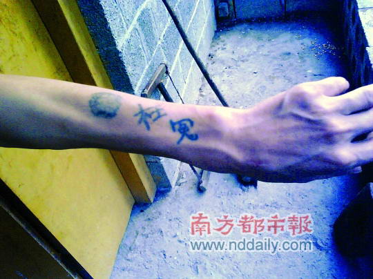 王子发:不是在监狱,是在看守所。判了死刑后,当时他们说你判了死刑,不能跟家里人接近,我很痛苦,就文上去了。看守所里面很多人文身,人家有那个针,我就拿来搞,在左边的小手臂上,就文了“冤枉”两个字。