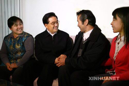 12月31日,中共中央总书记、国家主席、中央军委主席胡锦涛到天津市看望和慰问基层干部群众。这是胡锦涛在河东区彩丽园廉租房小区同低保户高会来一家人拉家常。 新华社记者鞠鹏摄