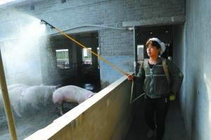 17日,河南省沁阳一家养猪场人员正在对猪舍进行清洁消毒。新华社记者 朱祥 摄