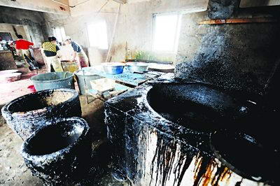 屋内右侧,灶台锅里烧满一锅黑褐色液体。原来,加工鸭子时,那些不易剔除干净的小毛在这个锅里“打个滚”,便是一只白白嫩嫩,连细毛都没有的“白胖鸭”。“这锅里是什么东西啊?”记者指着锅里黑褐色的液体问。“松香。”工人也是实话实说。“为什么用松香?”“这样拔毛干净。”“我们平时不怎么用,只是加工量增大的时候,偶尔用一下提高效率。毕竟这样可以保证每只鸭子在经过拔毛后,表皮的光滑。”此时,其中一名工人似乎觉察到什么,慌忙辩解道。记者随即在一个角落里,找到一块尚没投进锅里的松香,果然发现里面含有白色的石蜡。“那你们每天要宰杀加工多少只鸭子,加工好后送到哪里?”工作人员称,大概几百只吧,送去的地方都是老板亲自经手,具体他们也不太清楚。只是听说,一般都是卤菜店、菜场等地方。记者随后向当地工商部门反映,可由于周六休息,大门紧锁并没有工作人员上班。