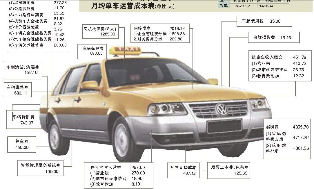 经由广州市物价局核算,2007年到2009年,广州市出租车承包制车辆的月均单车运营成本平均为13373.92元/月,其中企业成本6314.47元/月,司机支出7059.45元/月(未含承包费);供车制和挂靠制车辆的月均单车营运成本平均为11496.42元/月,其中企业成本4436.97元/月,司机支出7059.45元/月。