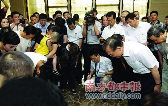 温家宝在金球国豪酒店看望部分死伤人员家属,向家属深深鞠躬,表示深切慰问。新华社记者 黄敬文 摄