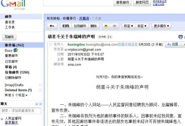 九、2011年9月30日下午8点07分,胡教授教授发来最后通牒的电子邮件: