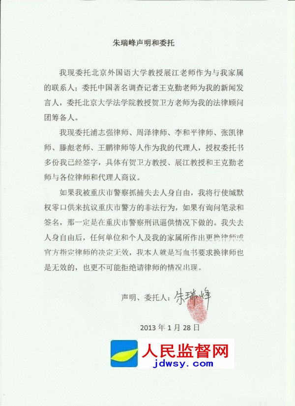 朱瑞峰声明和委托