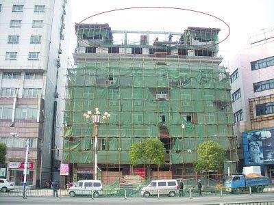 “楼加加”位于姜堰城区中心人民中路,是该市最繁华的地区。昨天下午,记者现场发现,整幢大楼被绿色防护网和脚手架“包裹”得严严实实,施工现场一片繁忙,楼顶施工人员和地面工作人员在紧张工作,成捆的建筑材料从地面被运至楼顶。仰望上空,记者看到被“硬加”到5层楼楼顶的两层建筑,已经显出大模样。