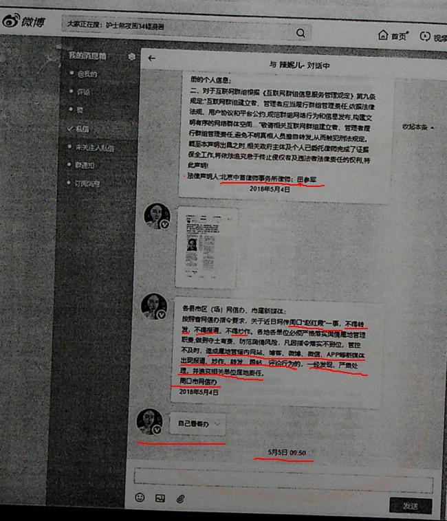 “周口杨红霞”——杨瑞的妹妹杨海燕又给何光伟发了一份落款“周口市网信办”指令。该指令称:“各县市区(场)网信办、市属新媒体:按照省网信办指令要求,关于近日网传周口“赵红霞”一事,不得转发,不得报道、不得炒作。各地各单位必须严格落实舆情属地管理职责,做到守土有责、防范舆情风险,凡因指令落实不到位,管控不及时,造成属地管辖内网站、博客、微博、微信、APP等新媒体出现报道、炒作、转发、跟帖、评论行为的,一经发现,严肃处理,并追究相关单位属地责任。周口市网信办 2018年5月4日。