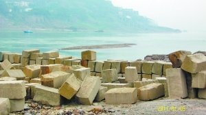 堆积在江边等待切割的青石