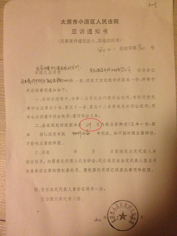 “这不是贼喊捉贼嘛!”赵勇无比愤怒。他在2013530日收到了太原市小店区法院发出的《应诉通知书》。其中第二条写道:“在收到起诉状副本后30日内提出答辩状,送交本院狄村法庭审判庭。”