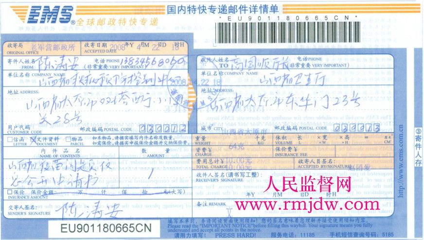 本图:中华人民共和国公民陈涛安于2008年4月22日18点在太原市老军营邮电所向山西省政府部门寄出申请;山西省政府部门应在2008年5月4日之前公开信息,否者,中国公民陈涛安先生有权将山西省政府法人(省长)诉之法院。