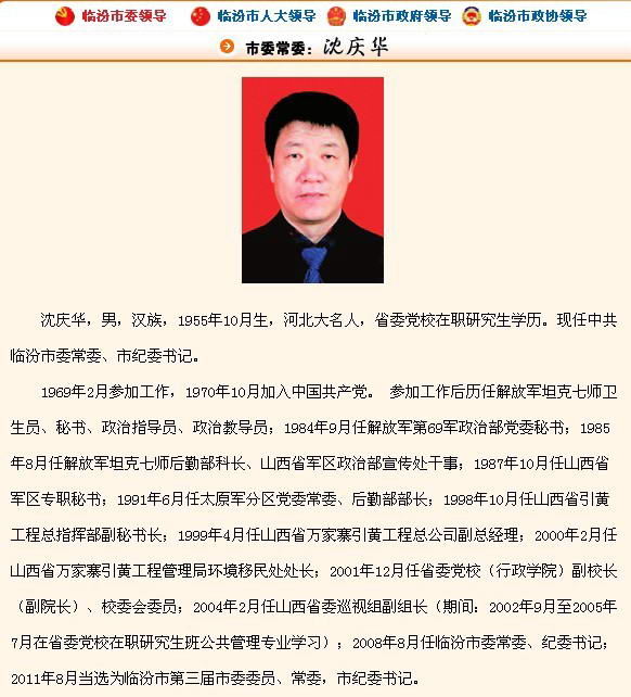 在临汾政府网上领导干部介绍栏目中,本人发现了纪委书记沈庆华“13岁参军、15岁入党”的弱智简历,相信广大干部群众都发现了这个侮辱广大党员干部群众智商的假档案,沈庆华是省管干部,不知道作为组织部长的您有没有看过这个滑天下之大稽的干部简历?临汾政府网站上,沈庆华的简历赫然在列:“1955年10月出生,1969年2月参军,1970年10月入党”,无数网友发出疑问:“沈庆华15岁入的什么党,是少先队吧?!”不知道作为组织部长的您看了这份简历,有没有用简单的加减法计算一下?