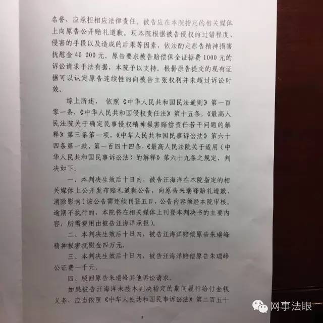 朱瑞峰表示在天涯社区等网站论坛对我朱瑞峰进行人身攻击、诽谤的汪海洋今天得到报应。”从判决书结果来看:“北京市西城区人民法院今天(1122日)依法宣判如下:一、被告汪海洋在本院指定媒体上公开向原告朱瑞峰赔礼道歉。二、被告汪海洋赔偿原告朱瑞峰精神损害抚慰金四万元。此前,基于另一起网络侵权案件,网络平台天涯网站由于监管问题,亦承担了自己作为网络平台提供者对于网站的侵权内容所产生的责任。北京市西城区人民法院于今年726日依法判决被告天涯社区赔偿原告朱瑞峰二万元,并连续三十天在其网站置顶位置向朱瑞峰赔礼道歉!该判决已经生效。
