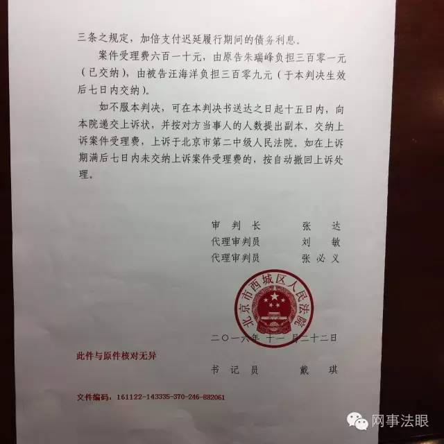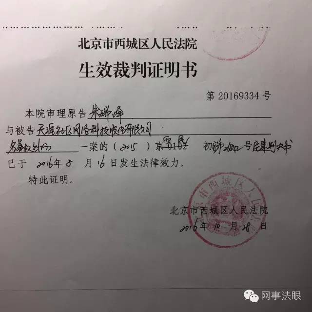 朱瑞峰表示:感谢北京市西城人民法院合议庭为我朱瑞峰主持公道!并贴了判决书的照片,有图有真相!两张图片是被告汪海洋的败诉判决书,另外三张是被告天涯社区已经生效的败诉判决书和生效证明。